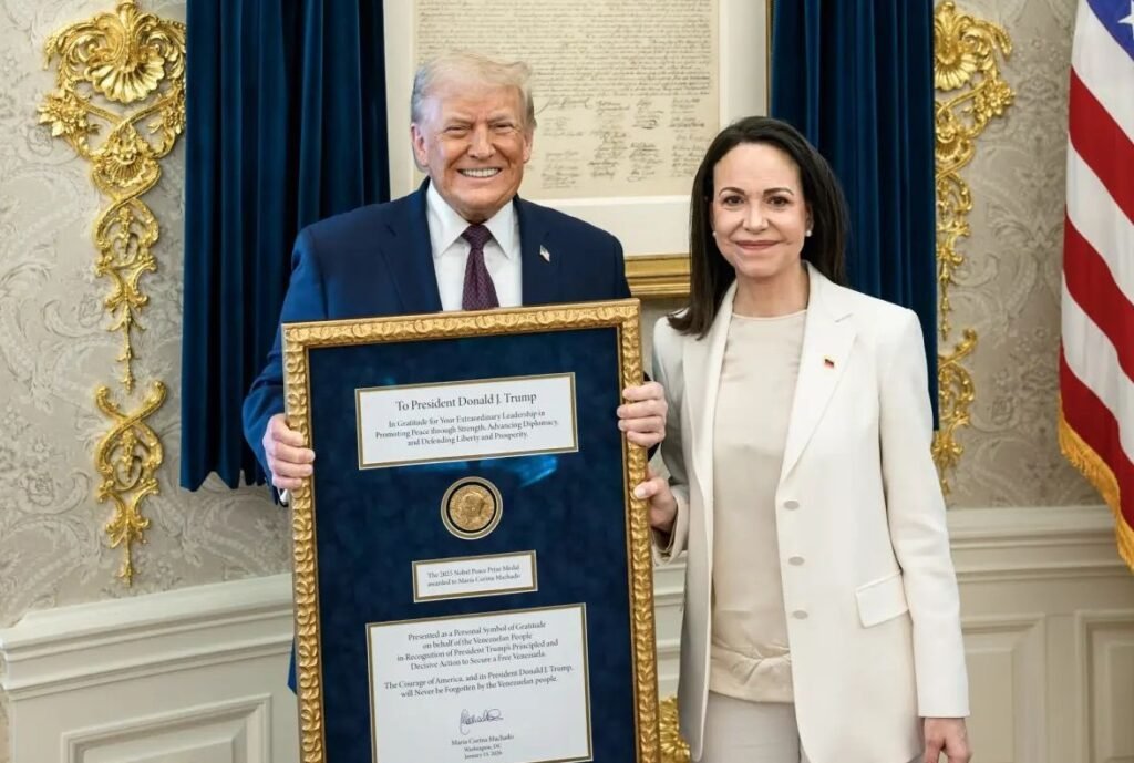 “I presented the president of the United States the medal of the Nobel Peace Prize,” Machado later told journalists in English, calling it “a recognition for his unique commitment with our freedom”.