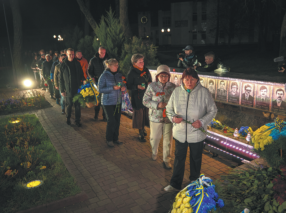 People streamed into the central square of Slavutych in the early hours of Sunday, placing candles on a large radiation hazard symbol laid out on the ground as a midnight commemoration began for those killed in the Chernobyl disaster 40 years ago and the thousands who risked deadly radiation exposure to contain its aftermath.